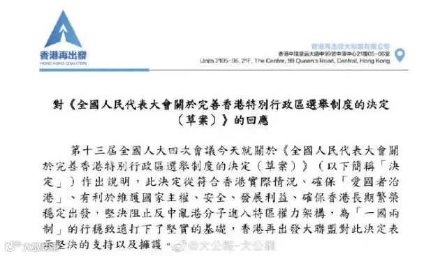 香港再出发大联盟认为,根据宪法、基本法以及香港国安法中的相关条文,完善特区选举制度是中央事权,所以“决定”合法、合情以及合理。同时,本次由中央制定政策来解决香港的选举问题,不仅有利于香港社会的整体发展,更有利于香港社会日后集中精力解决深层次的矛盾,保障香港市民的福祉。