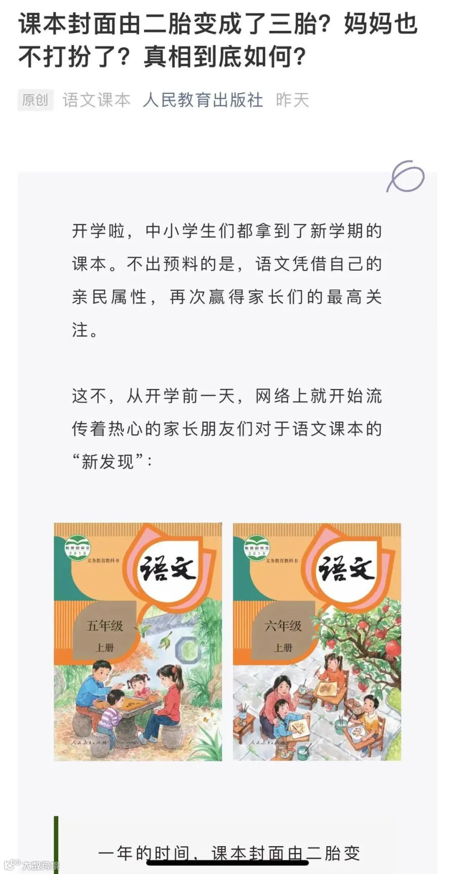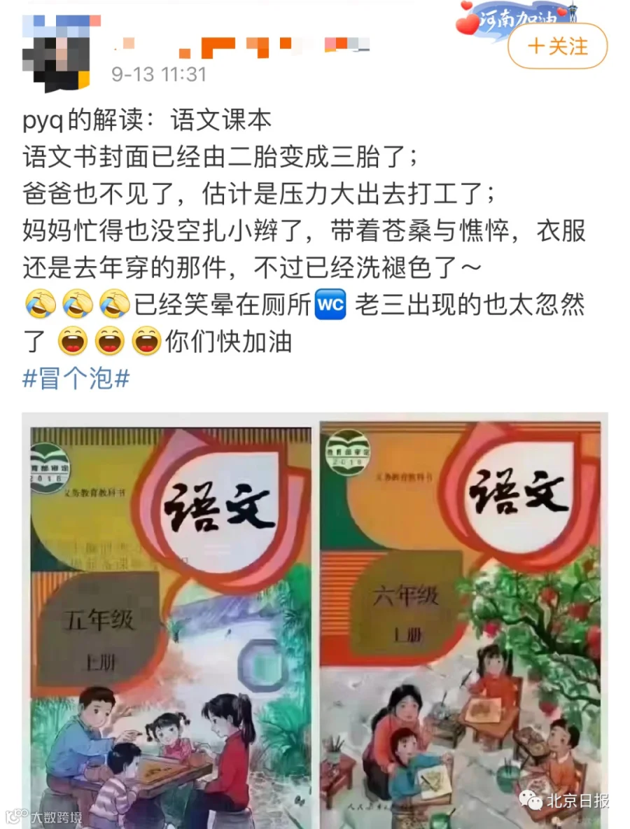 开学没几天,网络上就开始流传着热心家长们对语文课本的“新发现”:一年的时间,课本封面由二胎变成了三胎,妈妈也不打扮了,头发随便一扎,衣服还是去年那件,只是旧了。多了个娃,爸爸也不在家下棋了,估计为了养家加班挣钱去了。