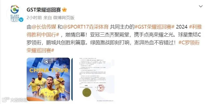 12月17日,2024荣耀巡回赛·利雅得胜利中国行官方社交媒体发布消息称,C罗将带领利雅得胜利队,于2024年1月在深圳大运中心体育场进行两场比赛,对手分别为上海申花队和浙江队。相关海报中,C罗处于中间最显眼的位置。