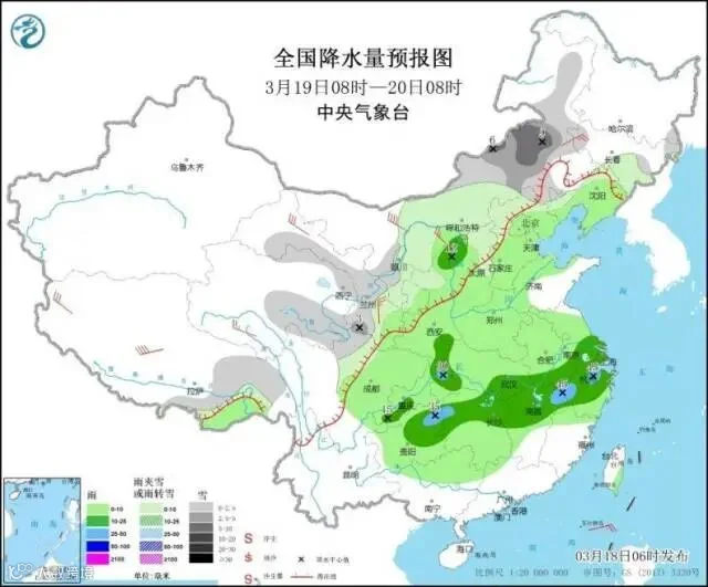 除了沙尘天气,这股冷空气还会给我国中东部地区带来大范围的雨雪天气,其中明天,降水将迅速扩张至华北、东北一带,其中内蒙古中部和东部、吉林东南部、西藏东部、西北地区中东部、华北北部、川西高原北部等地部分地区有小到中雪或雨夹雪,其中,内蒙古中东部等地部分地区有大雪(5~9毫米)。东北地区南部、华北大部、黄淮大部、江淮、江汉、江南大部、西南地区东部、华南北部等地部分地区有小到中雨。