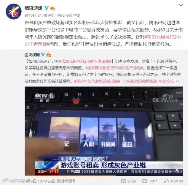 对此,腾讯游戏官方微博9月6日曾表示:“账号租卖严重破坏游戏实名制和未成年人保护机制,截至目前,腾讯已向超过20家账号交易平台和多个电商平台起诉或发函,要求停止相关服务。8月30日关于未成年人防沉迷的最新规定出台后,腾讯予以了坚决落实。针对#花33元租号打2小时王者荣耀#问题,我们也呼吁尽快出台相应法规,严格管制帐号租卖行为。”