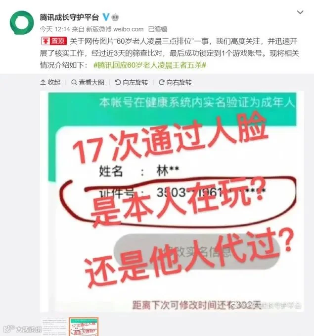 腾讯成长守护平台表示,从今年3月到现在,该账号因屡被判定疑似未成年人操作,前后共计17次触发并全数通过了腾讯健康系统的人脸识别验证。从技术手段和实际验证结论来看,系统认为确系“本人”在进行游戏。“至于现实中该账号是否属于‘他人代过人脸’,我们无法判断,也没有相关权限在企业后台数据之外做进一步确认。”