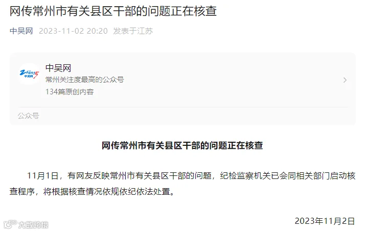 11月2日20点20分常州广播电视台微信公众号“中吴网”发布消息称,11月1日,有网友反映常州市有关县区干部的问题,纪检监察机关已会同相关部门启动核查程序,将根据核查情况依规依纪依法处置。