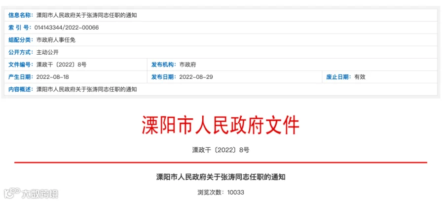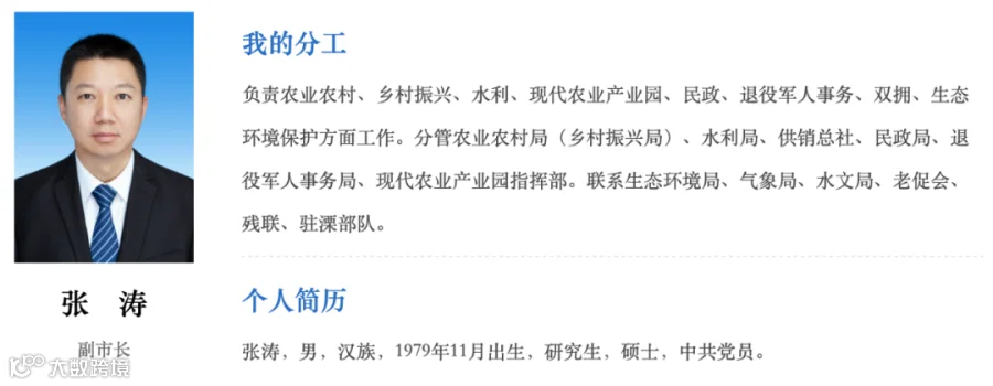 据溧阳市政府官网显示,张涛出生于1979年11月,研究生学历,硕士学位,中共党员。他于2022年8月任溧阳市副市长,负责农业农村、乡村振兴、水利、现代农业产业园、民政、退役军人事务、双拥、生态环境保护方面工作。目前,张涛相关信息仍在溧阳市政府官网中显示。
