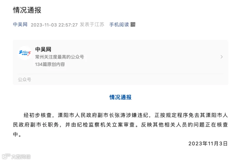 11月3日22时57分,江苏常州广播电视台官方微信公众号“中吴网”发布情况通报:经初步核查,溧阳市人民政府副市长张涛涉嫌违纪,正按规定程序免去其溧阳市人民政府副市长职务,并由纪检监察机关立案审查。反映其他相关人员的问题正在核查中。