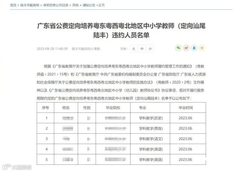 记者调查发现,《广东省公费定向培养粤东粤西粤北地区中小学教师(定向汕尾陆丰)违约人员名单》发布于今年9月底,共有5名毕业生未履约,毕业时间为2023年6月。