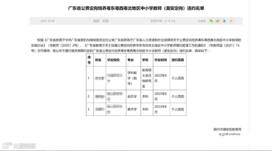 同样在今年9月,湛江雷州市教育局发布通报,2人于2023年毕业后因个人原因未履约;另2人于2022年毕业在雷州市服务满1年后因个人原因不再继续履约。