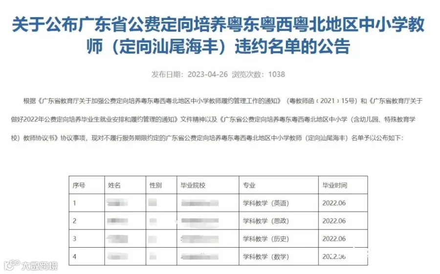 日前,广东陆丰市教育局发布《广东省公费定向培养粤东粤西粤北地区中小学教师(定向汕尾陆丰)违约人员名单》,引起社会关注。该名单显示,共有5名毕业生未履约。