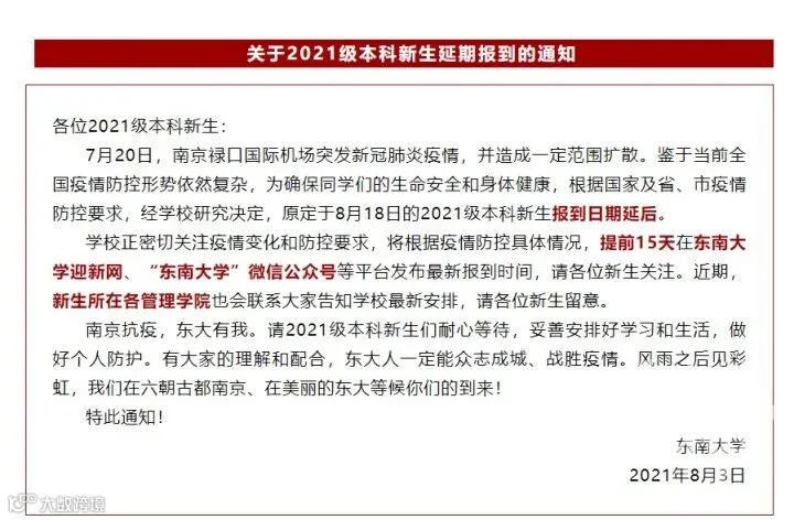 7月28日,东南大学发布通知,对2021年暑假放假安排做出调整,原定8月2日放假暂不执行,2021-2022学年秋季学期提前至2021年8月2日开始。