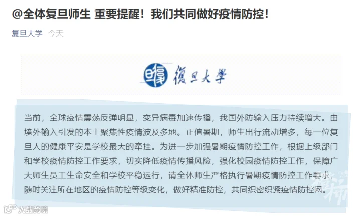 复旦大学规定,所有师生员工离沪要报备,做好路途个人防护,开学前14天开始开展自我健康管理;非必要不前往国内疫情中高风险地区,非必要不出境。出行时,做好个人防护、手部消毒等,每日自主开展健康监测。