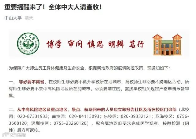 所有来自或途经国内疫情中高风险地区的师生员工暂缓返校,应在抵沪后尽快向所在居村委和单位(或所住宾馆)报告,最迟不得超过12小时。