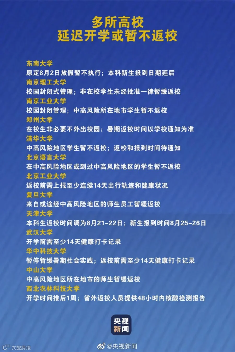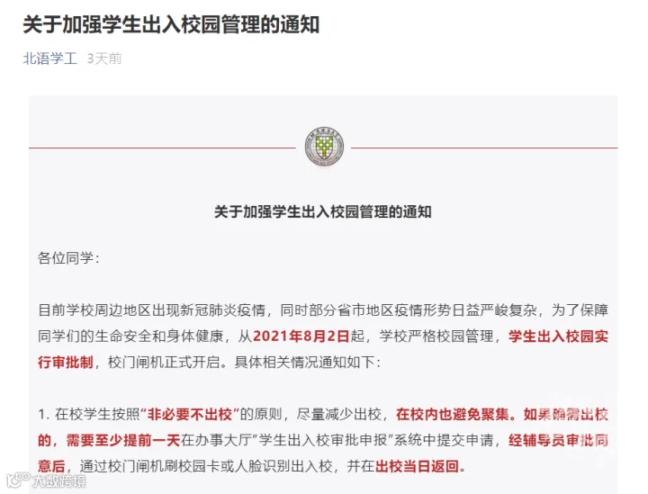 8月3日,清华大学发布《关于秋季学期学生返校和新生报到有关安排的通知》,明确当前处于中高风险地区的学生,暂不返校和报到,具体返校和报到时间等待学校进一步通知。