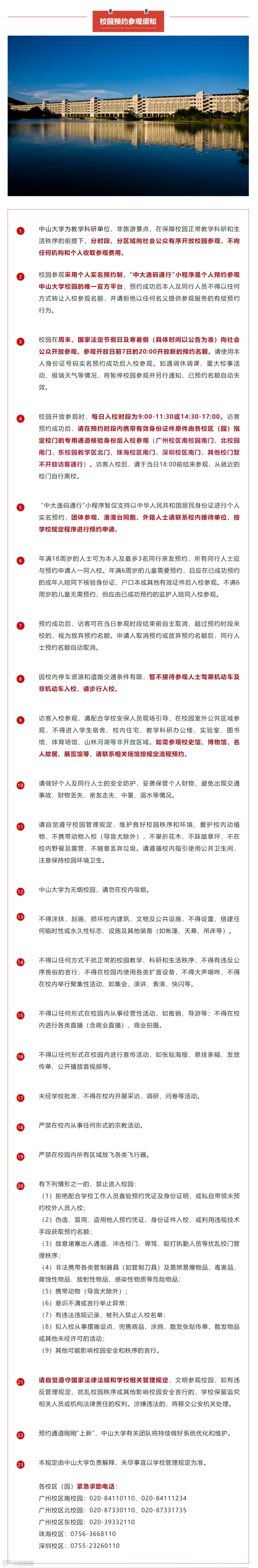 通知称,为满足社会公众需求,中山大学在确保学校正常工作、教学、科研、生活秩序的基础上,自2023年9月27日起,面向社会公众开放周末、国家法定节假日参观的预约通道,预约成功后入校时段为当天9:00-11:30或14:30-17:00,寒暑假期间开放参观安排另行公告。
