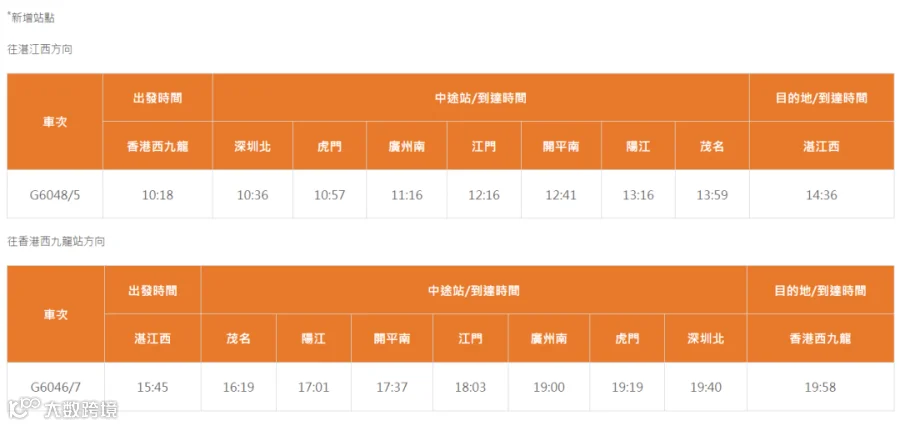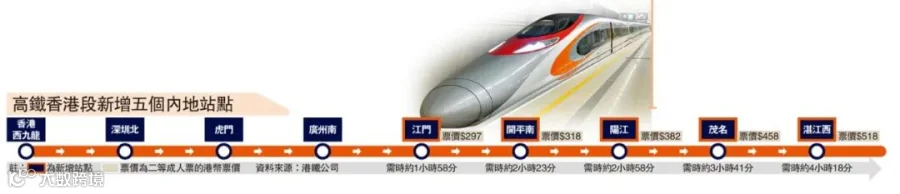 继今年先后推出广州东及成都东新线、增加班次以及推出新的福田“灵活行”变更车次安排后,将于10月11日起开通新线连接江门、开平南、阳江、茂名及湛江西5个新站点,每日提供北行及南行各一班列车。同时,往来香港西九龙站与广州东站,以及深圳福田站的列车服务亦会由同日起加强。