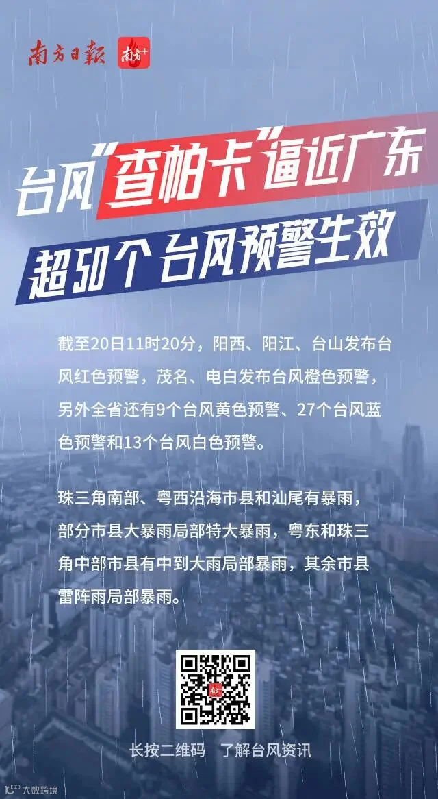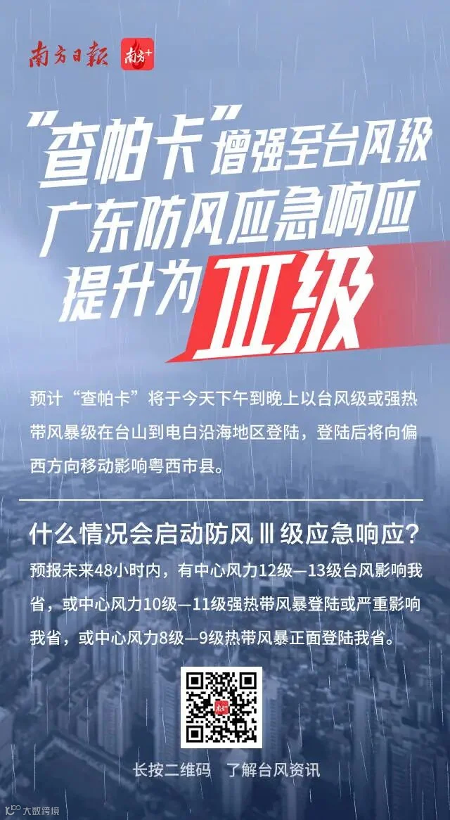 今年第7号台风“查帕卡”已于7月19日23时加强为台风级,中心附近最大风力12级,达到33米每秒的风速。预计,台风“查帕卡”20日下午到傍晚在台山到电白沿海地区登陆。广东省防汛防旱防风总指挥部办公室、广东省应急管理厅决定于7月20日零时将防风Ⅳ级应急响应提升为防风Ⅲ级应急响应。