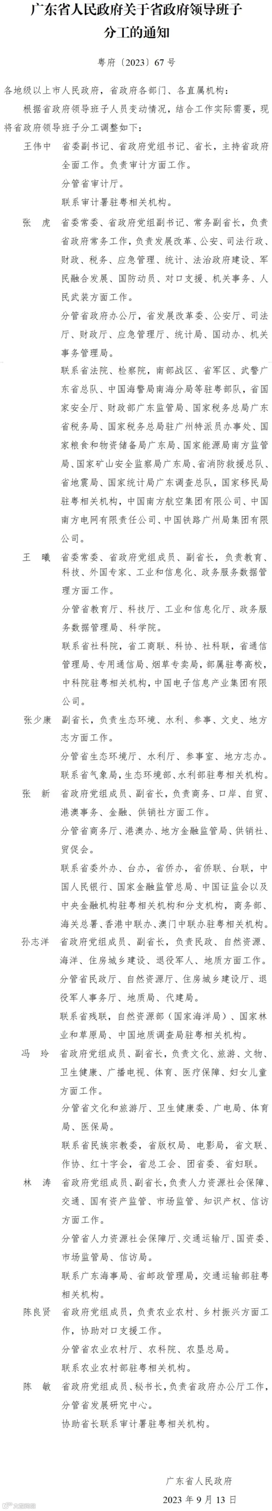 9月15日,广东省人民政府官网公布《广东省人民政府关于省政府领导班子分工的通知》,通知全文如下: