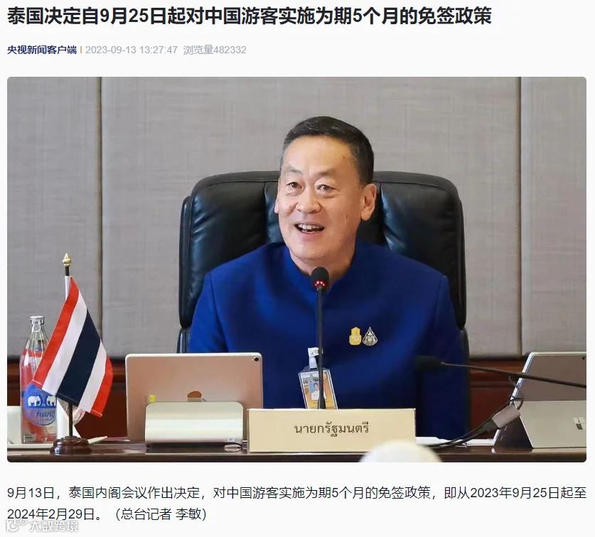 赛塔当日在内阁会议后对媒体表示,泰国将从本月25日起至2024年2月29日对中国游客免签。