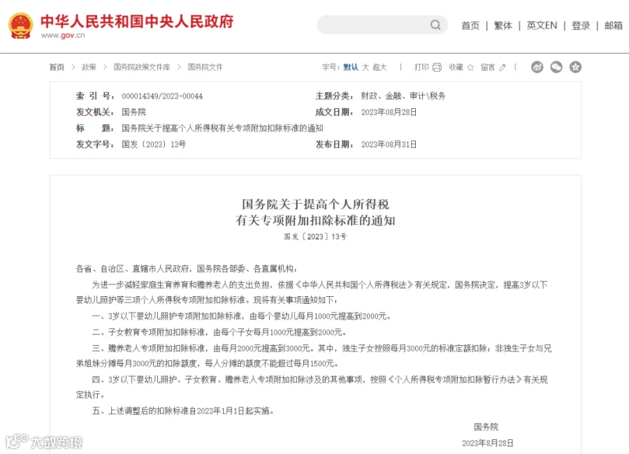 为进一步减轻家庭生育养育和赡养老人的支出负担,依据《中华人民共和国个人所得税法》有关规定,国务院决定,决定提高3岁以下婴幼儿照护、子女教育、赡养老人个人所得税专项附加扣除标准。现将有关事项通知如下: