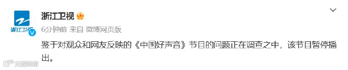 浙江卫视微博发布最新消息:鉴于对观众和网友反映的《中国好声音》节目的问题正在调查之中,该节目暂停播出。