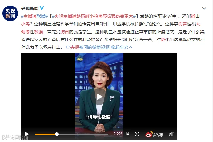 昨晚7时许,@央视新闻发表热评:已经煮熟的鸡蛋还能“返生”?河南一职业学校校长的“论文”引发公众震惊。“伪科学”污辱我们的智商不是第一次了,但此次却出自一校之长,其所教学生是否已经“中毒”,令人担忧;而刊登“熟鸡蛋返生”论文的杂志表示“给钱没有发不了的论文”,同样令人担忧。个别学术期刊收版面费已不新鲜,但是如此一再突破学术底线,实在败坏学术道德。这样的“伪科学”只要花钱就能刊发、就能办