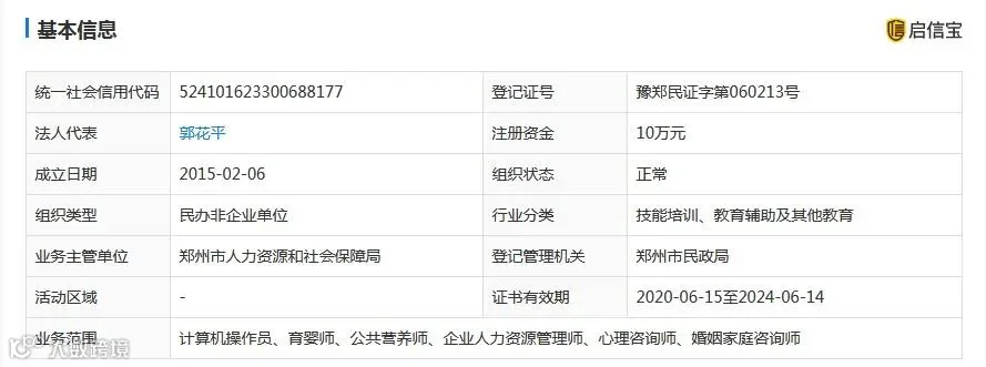 观察者网查询后发现,郑州市春霖职业培训学校成立日期为2015年2月6日,注册资金10万元,业务范围包括计算机操作员、育婴师、公共营养师、企业人力资源管理师、心理咨询师、婚姻家庭咨询师,主管单位是郑州市人力资源和社会保障局,法人代表是郭花平。