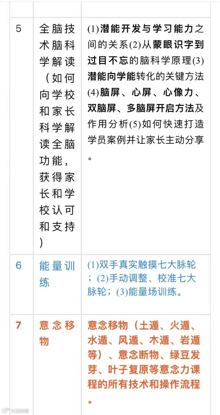 “快速作文创作”、“原子能量波动速读”、“超感知潜能全脑”、“意念移物”等课程