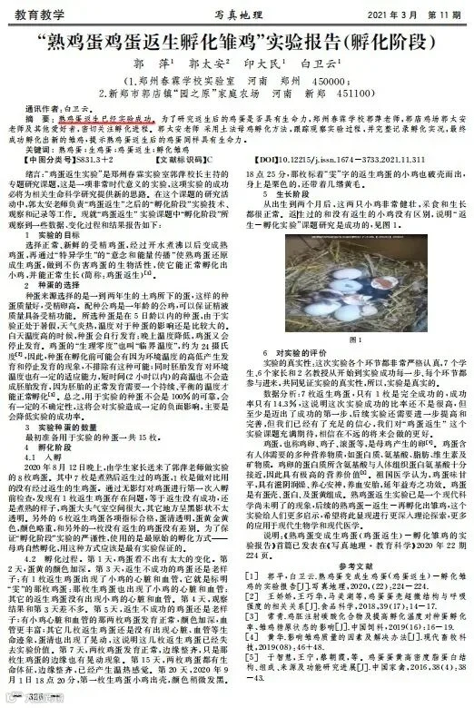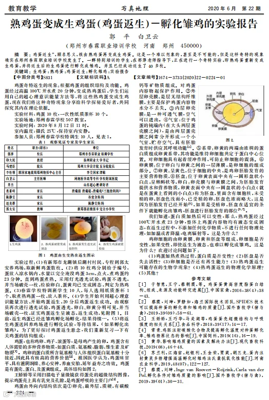 此前,郑州市春霖职业培训学校的郭萍和白卫云曾在《写真地理》2020年6月第22期发表《熟鸡蛋变成生鸡蛋(鸡蛋返生)——孵化雏鸡的实验报告》一文。