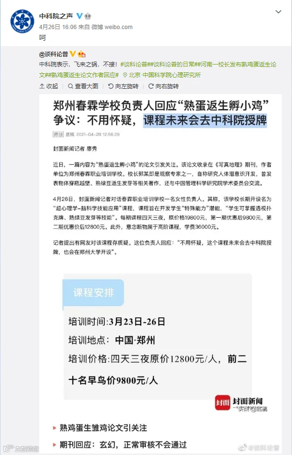 一篇熟蛋返生并孵出小鸡的论文“出圈”,受到网友质疑。明显反常识,这篇论文是如何“孵化”出来的?一个敢写一个敢发,相关期刊的审稿机制为何失灵?炒作“特异功能”借机推销课程,打的是什么利益算盘?