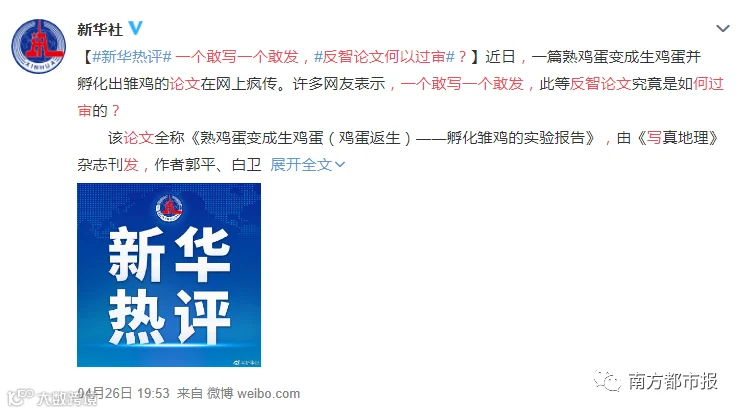 近日,一篇熟鸡蛋变成生鸡蛋并孵化出雏鸡的论文在网上疯传。许多网友表示,一个敢写一个敢发,此等反智论文究竟是如何过审的?