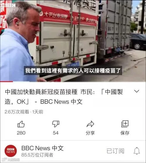 4月28日,英国广播公司(BBC)中文网发布了一段街头采访视频,BBC记者白洛宾(Robin Brant)前往浙江义乌,了解人们对于疫苗接种的看法。
