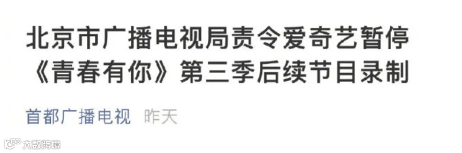 根据网络视听节目相关管理规定,北京市广播电视局现责令爱奇艺暂停《青春有你》第三季节目录制。