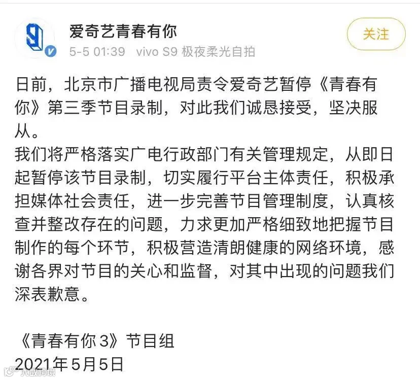 今天(5月5日)凌晨,@爱奇艺青春有你 发文,表示对北京市广播电视局责令停播通知,诚恳接受,坚决服从。即日起暂停该节目录制,认真核查并整改存在的问题。