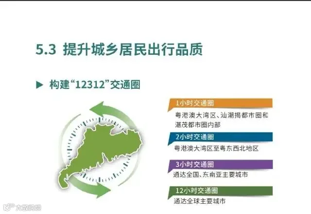 在提升城乡居民出行品质方面,《规划》提出,要构建“12312”交通圈,包括粤港澳大湾区、汕潮揭都市圈和湛茂都市圈内部形成1小时交通圈;粤港澳大湾区至粤东粤西粤北地区形成2小时交通圈;3小时通达全国、东南亚主要城市;12小时通达全球主要城市。