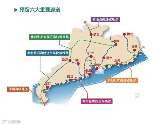 同时,《规划》提出预留六大重要廊道,包括京港澳高速磁悬浮、沪(深)广高速磁悬浮,粤北至沿海经济带高快速铁路、琼州海峡通道、粤东至粤西沿海高铁、北部生态发展区高快速铁路。