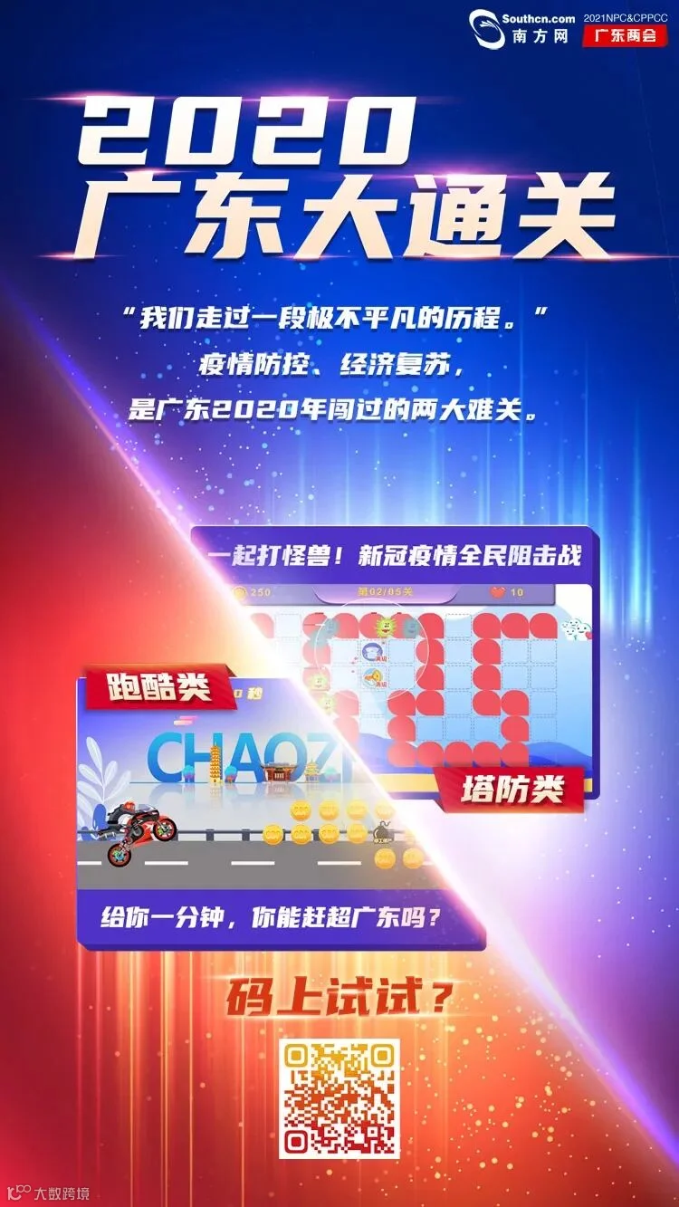 南方网策划推出互动产品《2020广东大通关》,你可以通过两个互动小游戏《一起打怪兽!新冠疫情全民阻击战》《给你一分钟,你能赶超广东吗?》,体验广东2020年面对的疫情防控和经济复苏两大难关。扫描上面海报二维码,“码上”试试?