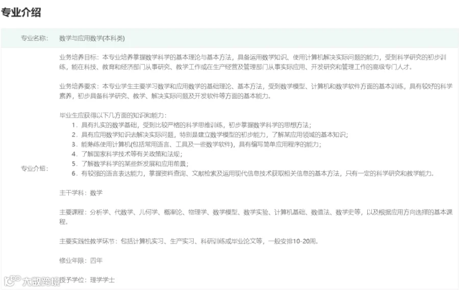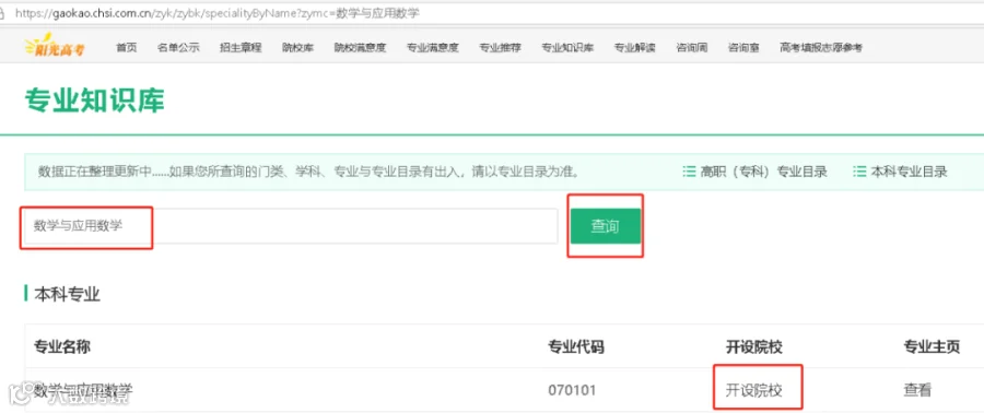 那当我们对感兴趣的专业有疑问时,又如何查询该专业详细信息呢?我们可以通过登录教育部阳光高考网,进行详细的查询及了解。在这里,我们以查询“数学与应用数学”的专业情况为例,如下图所示,我们在查询一栏里输入专业的名称,点击查询,在网页下方输出的查询结果中,再点击开设院校。进入下一页面后,我们点击感兴趣的院校,即可看到该院校对应“数学与应用数学”专业的详细介绍。