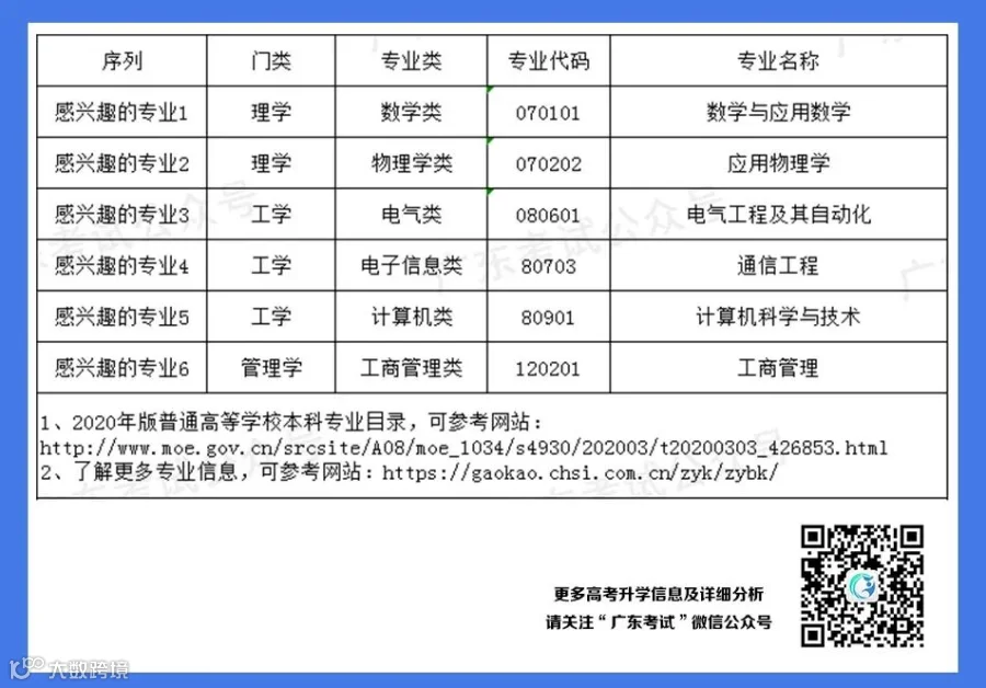 那接下来,我们的任务是要将自己感兴趣的至少6个专业信息,包括门类、专业类、专业代码、专业名称等,填写到表格中去,如下图所示,我们以数学与应用数学、应用物理学、电气工程及其自动化、通信工程、计算机科学与技术、工商管理这6个专业为例,将其信息填写完整。