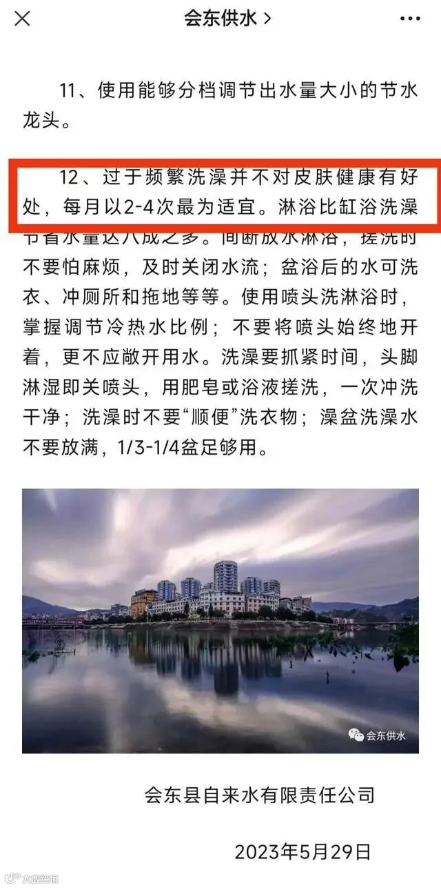 5月29日,四川凉山州会东县自来水有限责任公司发布消息,呼吁市民节约用水。通知中第12条“节约用水小窍门”建议称,“过于频繁洗澡并不对皮肤健康有好处,每月以2—4次最为适宜”,引发网络热议。
