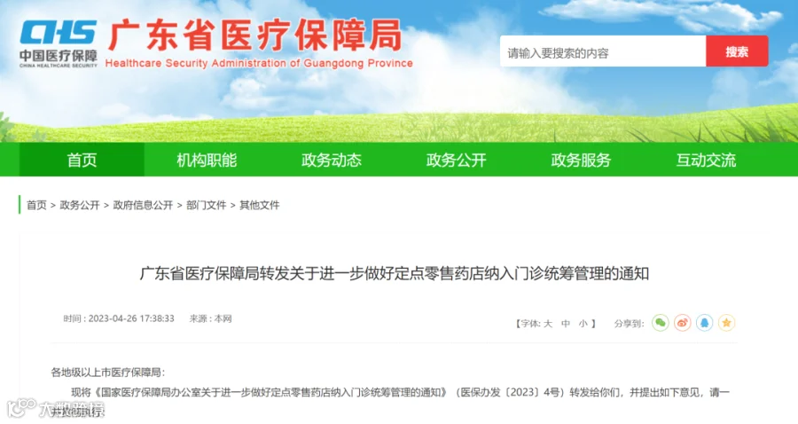 4月26日,《广东省医疗保障局转发关于进一步做好定点零售药店纳入门诊统筹管理的通知》(下简称《通知》)在省医保局官网公布,要求定点医疗机构通过门诊外配处方流转至定点零售药店的所有医保目录内药品,均纳入门诊统筹药品保障范围,医疗保险统筹基金按规定予以支付。