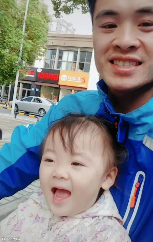 看到自己和爸爸一年多前的送外卖视频时,两岁的霏儿笑了,指着屏幕甜甜地说:“是爸爸”。