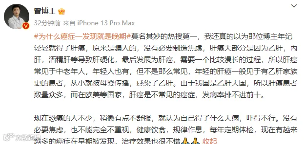 莫名其妙的热搜第一,我还真的以为那位博主年纪轻轻就得了肝癌,原来是骗人的,没有必要制造焦虑,肝癌大部分是因为乙肝,丙肝,酒精肝等导致肝硬化,最后发展为肝癌,需要一个比较漫长的过程,所以肝癌常见于中老年人,年轻人也有,但不是那么常见,年轻的肝癌一般见于有乙肝家族史的患者,从小就被母婴传播,感染了乙肝。