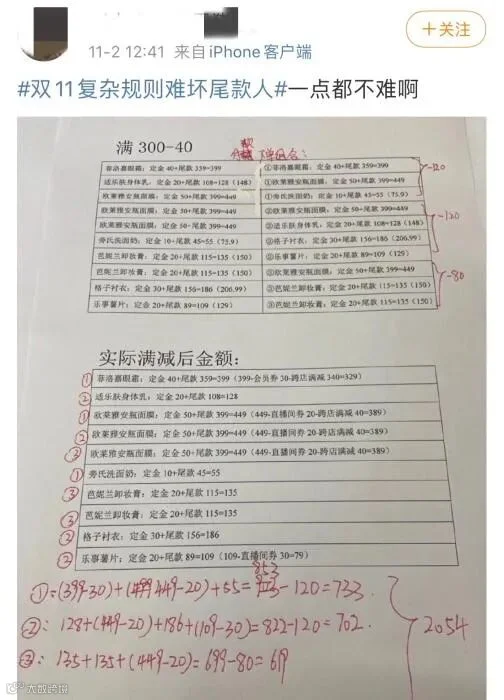 报告显示,监测期内,共收集有关促销规则类负面信息915029条,相关舆情集中在三个方面:电商选择性推送优惠券精准杀熟;不合并付尾款不能使用满减优惠券、不付尾款不能退款、付尾款必须熬到凌晨、双11当天不能退款等“硬规则”;诸如计算满减、津贴、红包、合并购买等堪比数学考题的玩法。