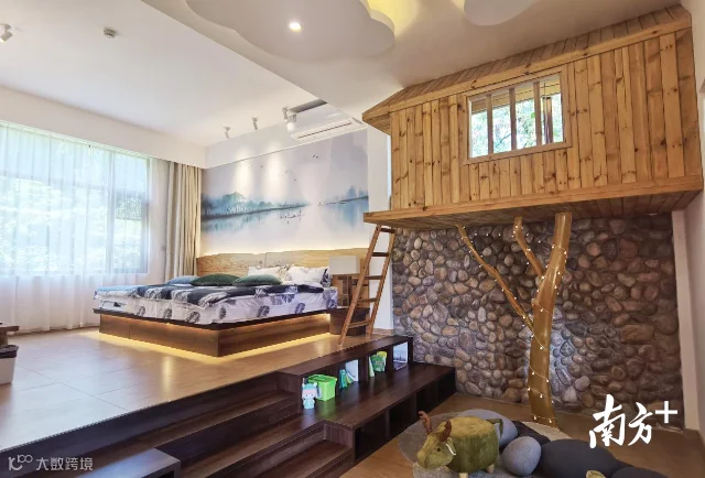 在碧桂园广东博意建筑设计院装修所所长余德彬的带领下,记者走进一间亲子房,一走进房间,首先被“树屋”、“城堡”、“云朵”等意象所吸引。接着,余德彬所长介绍说,这些意象设计体现了“亲子”、“友聚”等主题概念,且丰富室内空间的层次,增强感官体验,以及通过布艺、花艺、挂画等软装元素色调的搭配,打造个性鲜明的亲子主题客房。