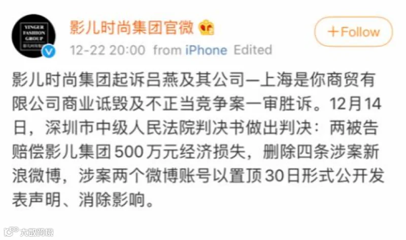 影儿代理律师黎孟龙向记者进一步说明:影儿与吕燕及其公司的纠纷中,双方互为竞争对手是不争的事实,双方在时尚服装业都具有很高的社会影响力。加上吕燕微博本身就是粉丝超过500万的“品牌主理人”自媒体,又有众多明星且其中不乏为吕燕服装承担广告代言明星的转发和点赞,影儿则是中国服装业的领军公司,这种相互竞争的关系,已经构成了依据《反不正当竞争法》认定“商业诋毁”的基本条件。
