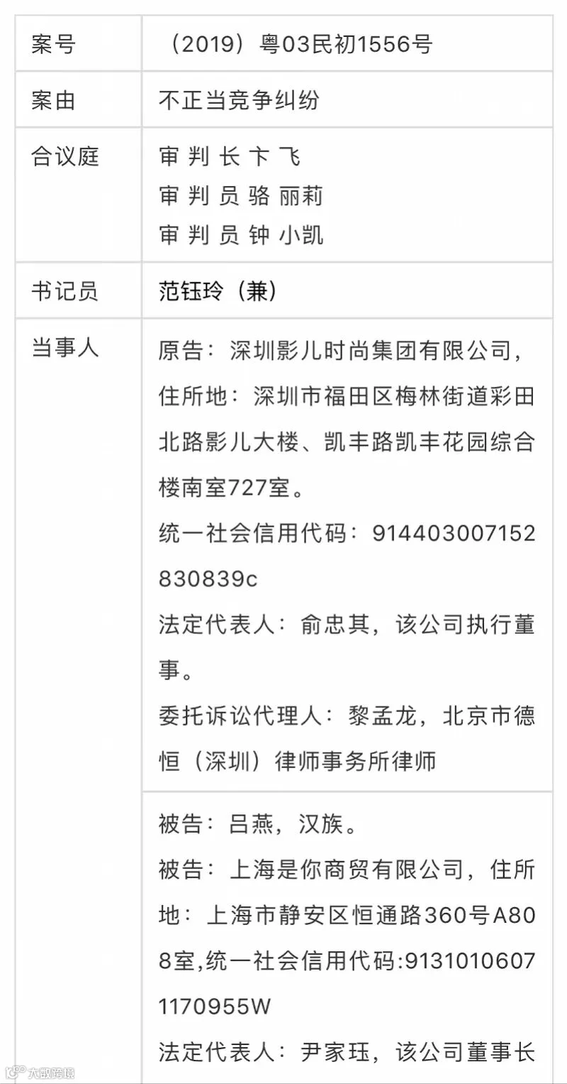实际上,吕燕和影儿的纠纷是两个案件:一是服装设计侵犯著作权和商品装潢纠纷,目前还在上海浦东新区法院审理,二是“商业诋毁不正当竞争”纠纷,在深圳中院审理。记者翻看两个案件的时间点注意到:自2019年3月27日吕燕连续发布四条诋毁影儿商誉的微博后,影儿向吕燕方发起两次声明无果后,于同年5月5日向深圳中院提起这个商业诋毁不正当竞争诉讼,吕燕方对该案提出管辖权异议被驳回后,分别于2019年7月5日及7月18日向上海浦东新区法院提起服装设计侵犯著作权和商品装潢诉讼,指控影儿抄袭其衣款。