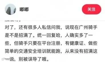 “只要在平台注册,有健康证、做些简单的交通安全培训就能跑,从来没有招满这一说,别被误导了哦。”