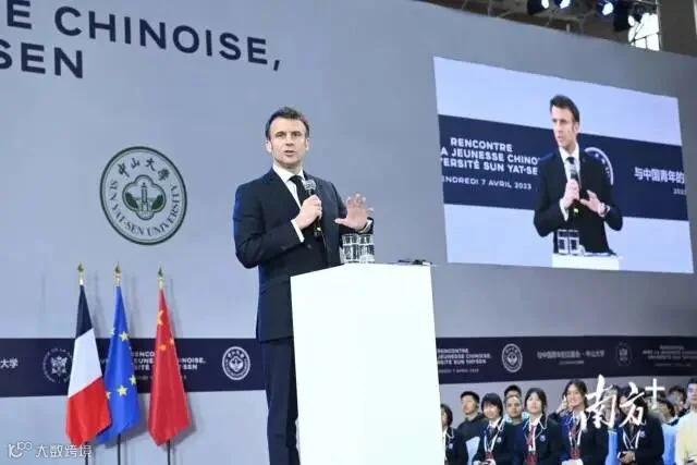 昨日(4月7日)下午,法国总统马克龙来到中山大学参观访问,在南校园新体育馆与学生进行交流。