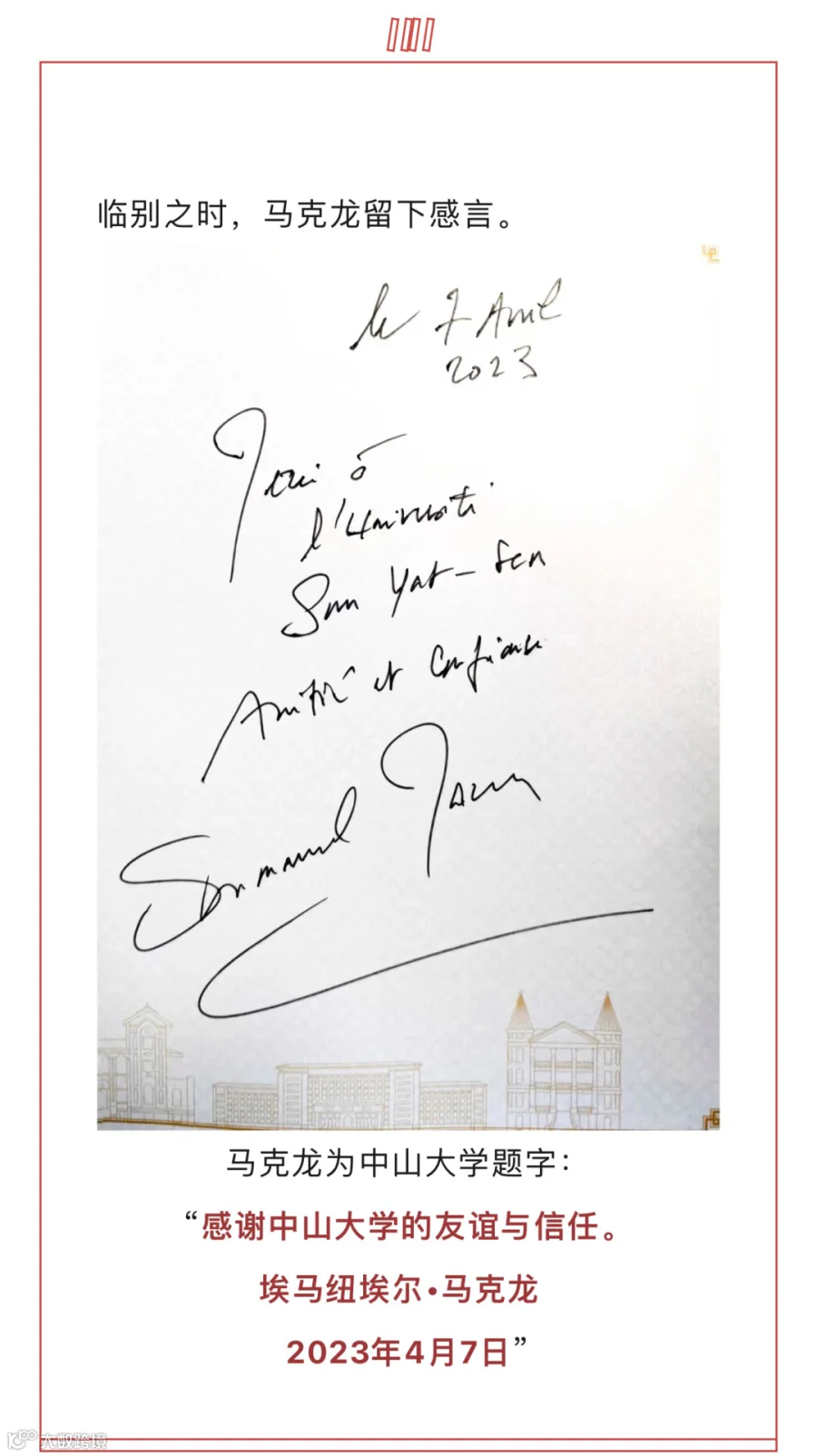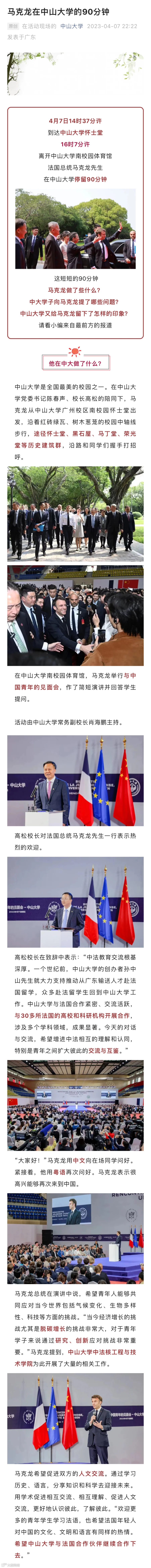 据中山大学微信公号4月7日22时许消息,4月7日14时37分许到达中山大学怀士堂,16时7分许离开中山大学南校园体育馆,法国总统马克龙先生在中山大学停留90分钟。这90分钟,他做了什么,看看↓↓