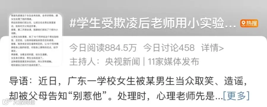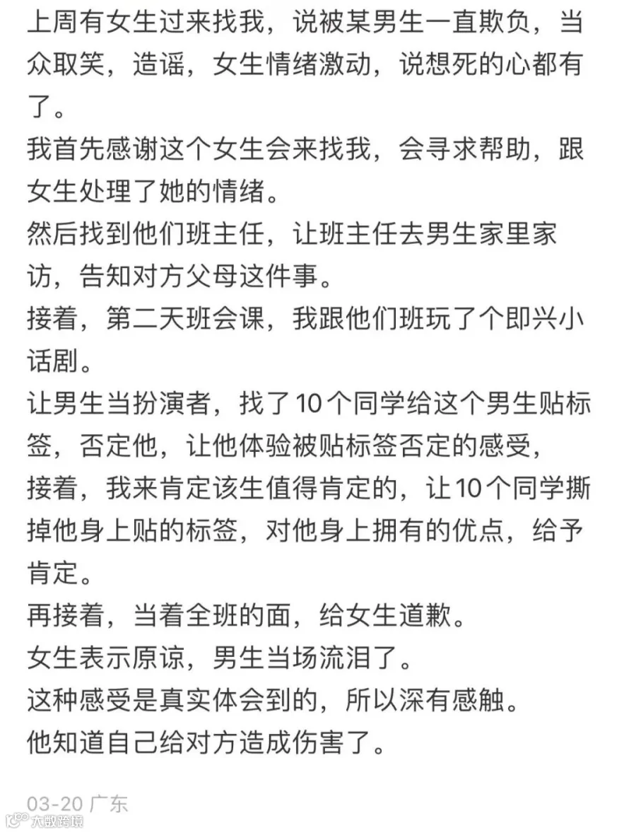 近日,该校的一名女学生向她求助,“说被某男生一直欺负,当众取笑、造谣,女生说想死的心都有”。