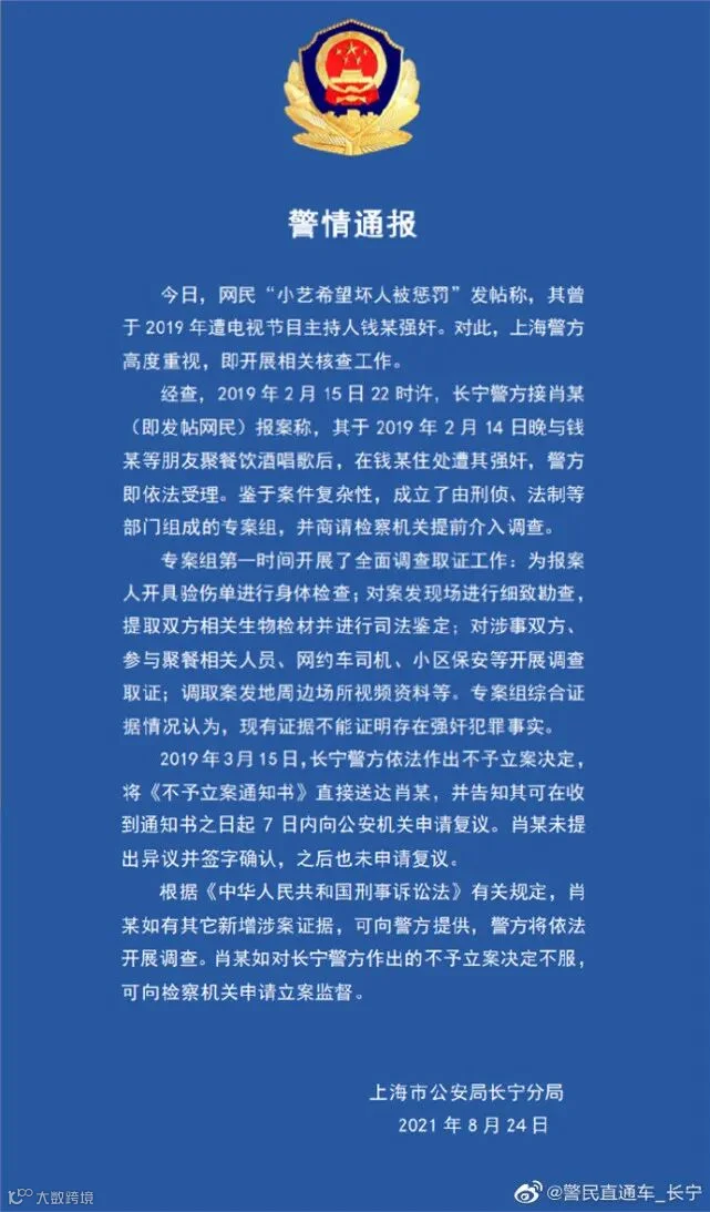 据通报:2019年2月15日,长宁警方接到报警,称其于2019年2月14日晚与钱某等朋友聚餐饮酒唱歌后,在钱某住处遭其强奸,警方受理此案。